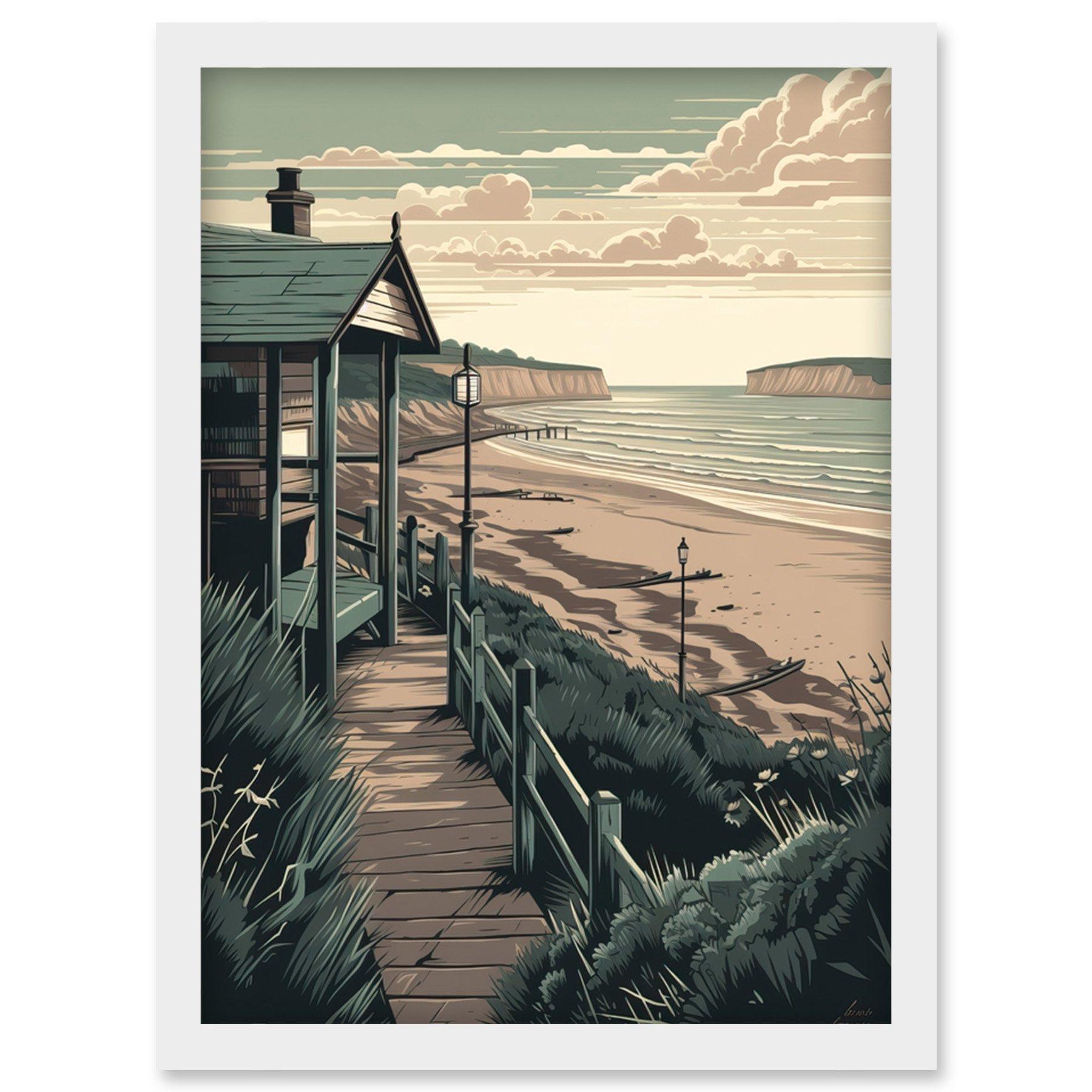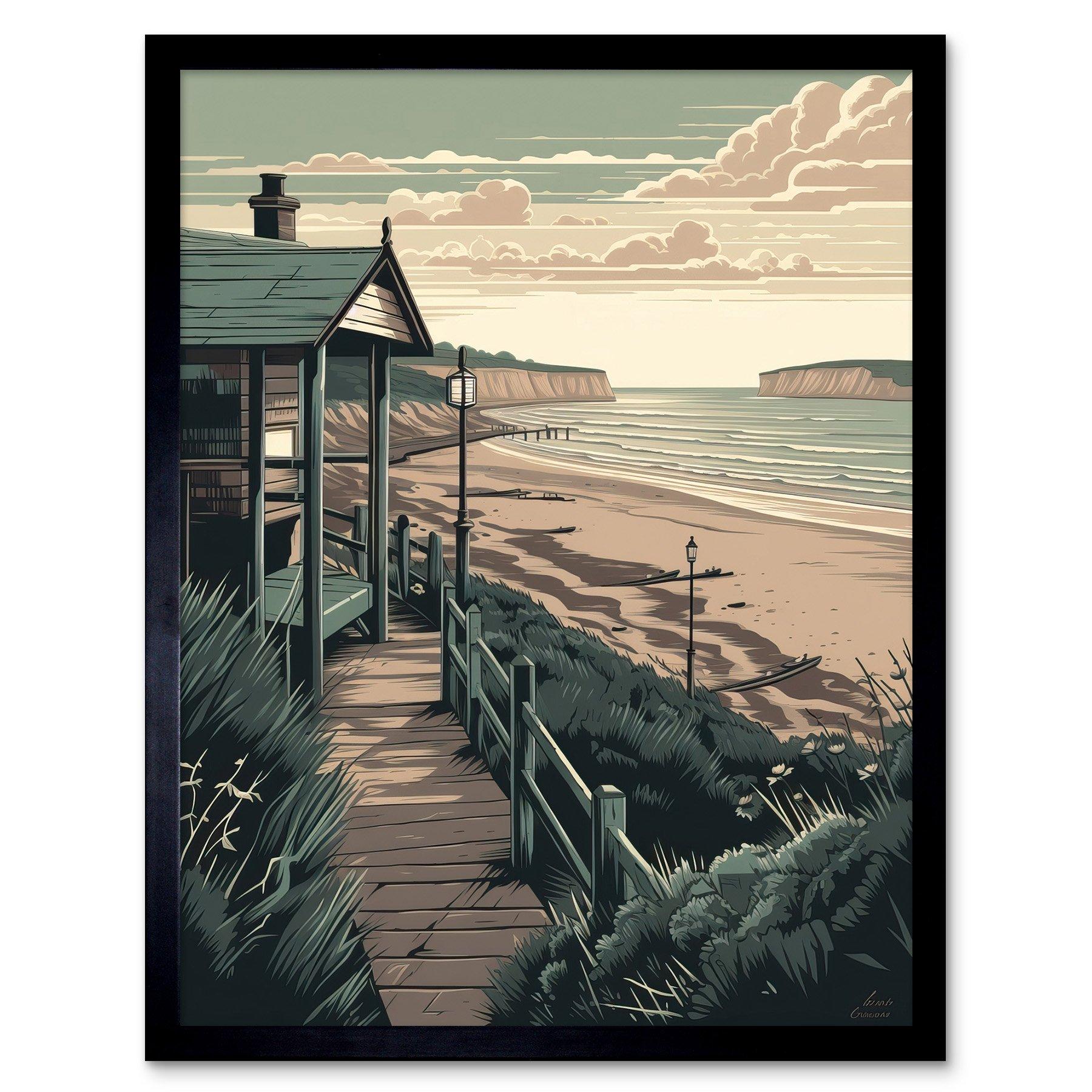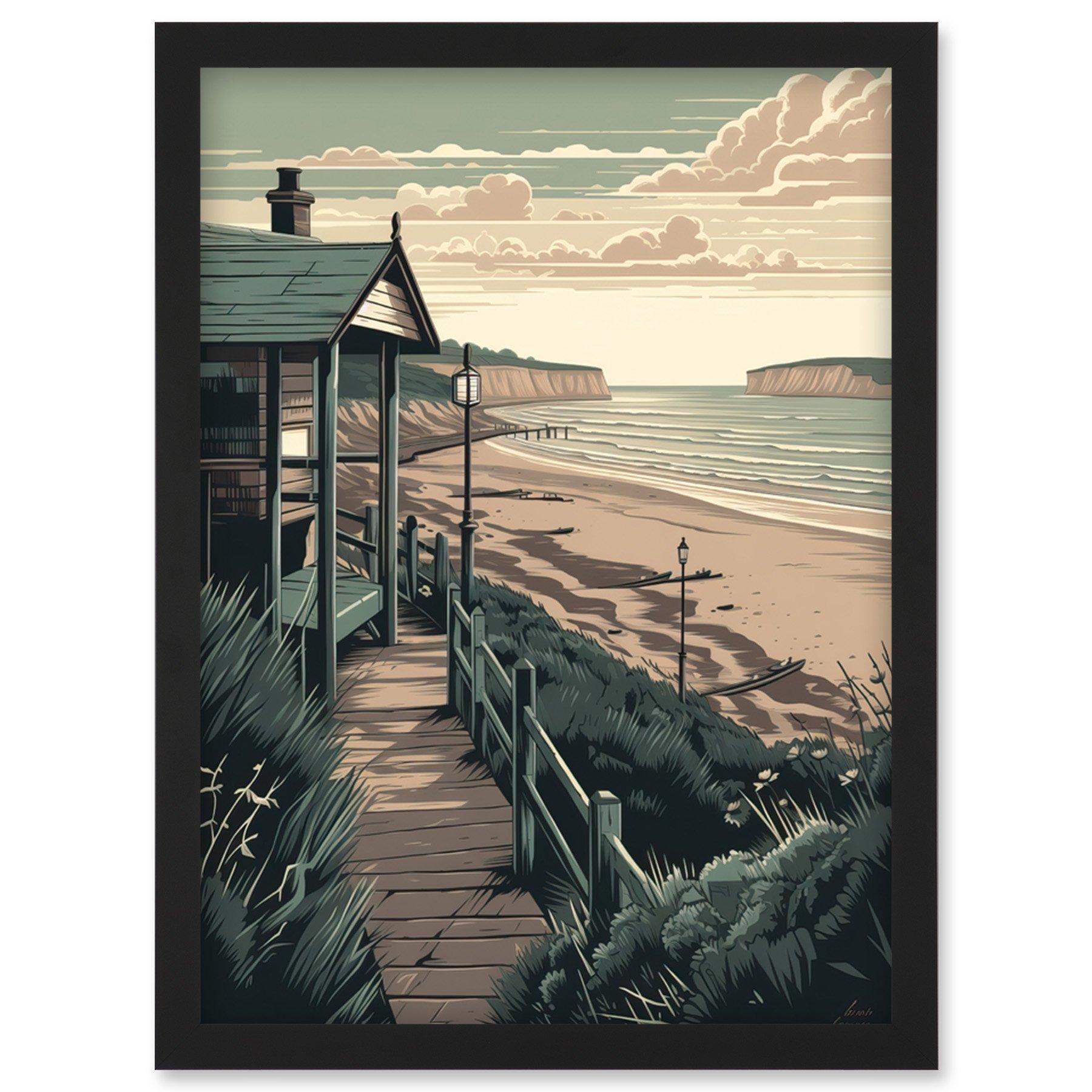 Summer Beach House Coastal Landscape Illustration Artwork Framed Wall Art Print A4