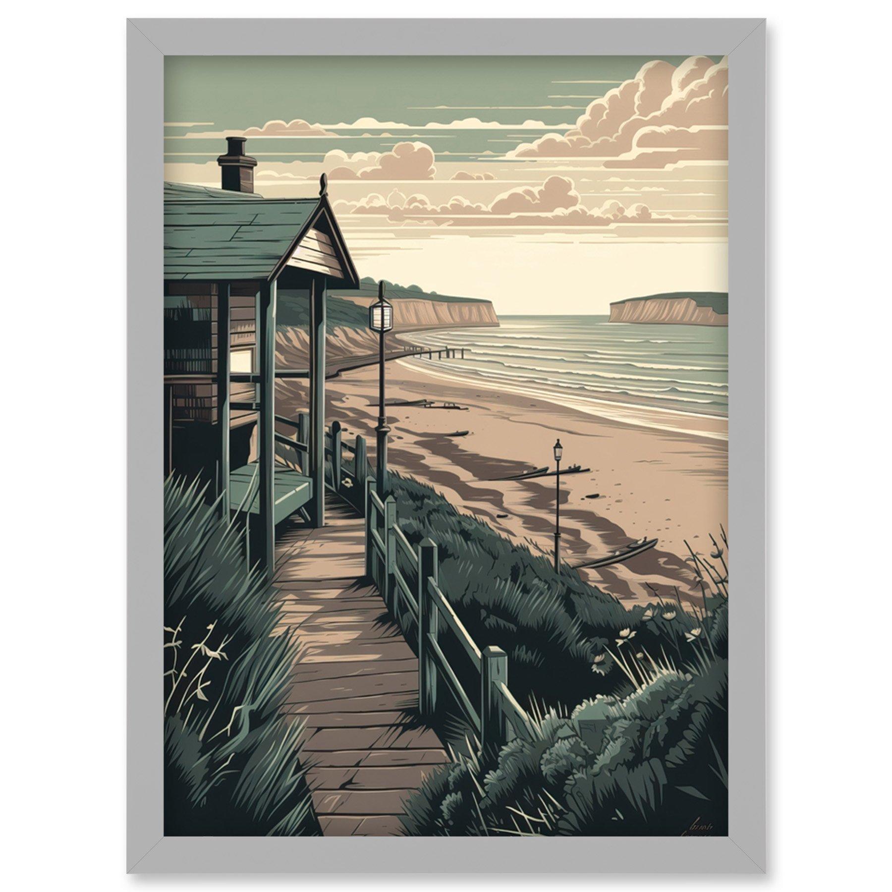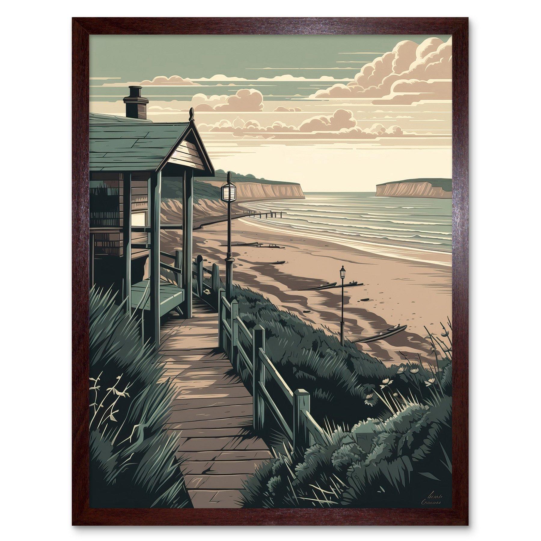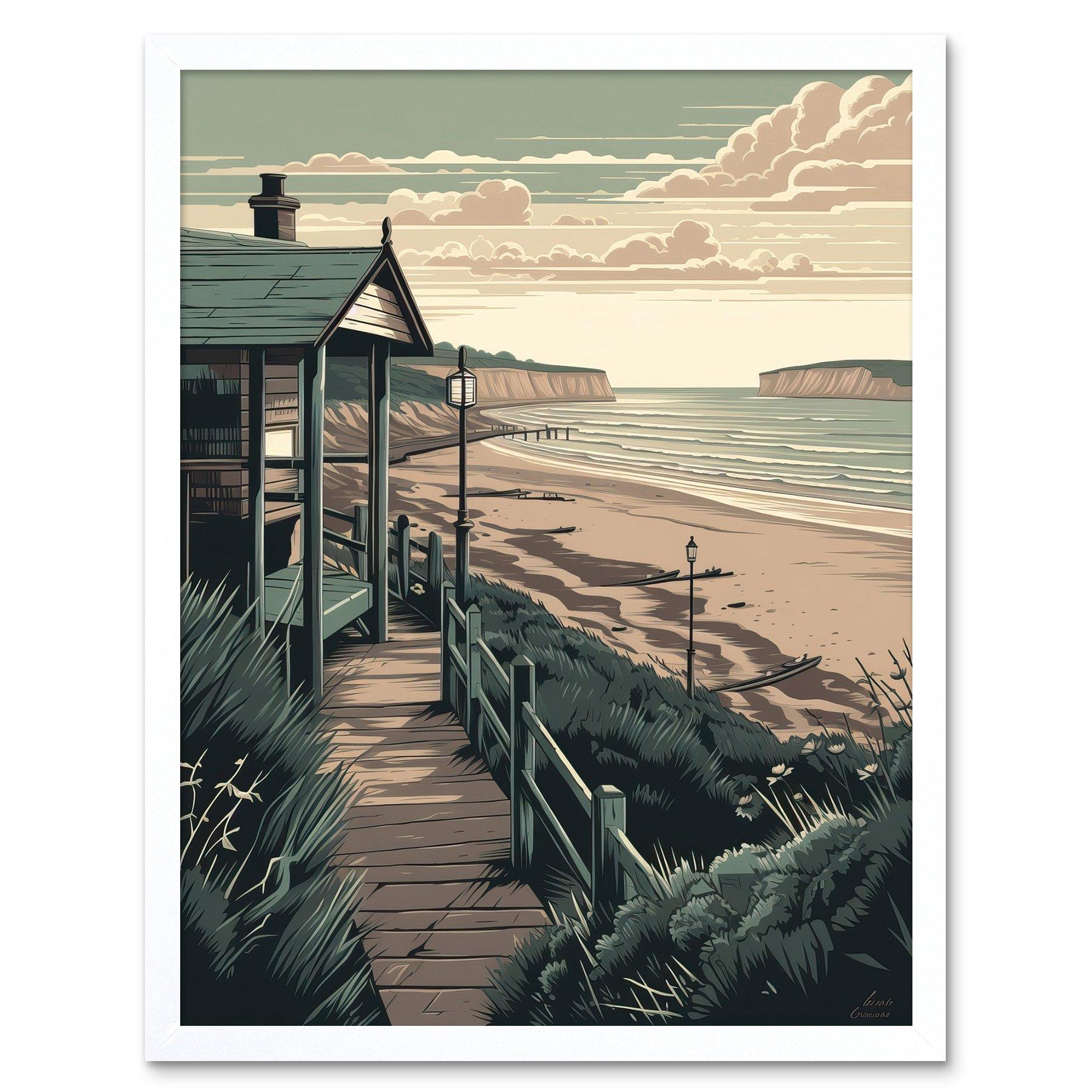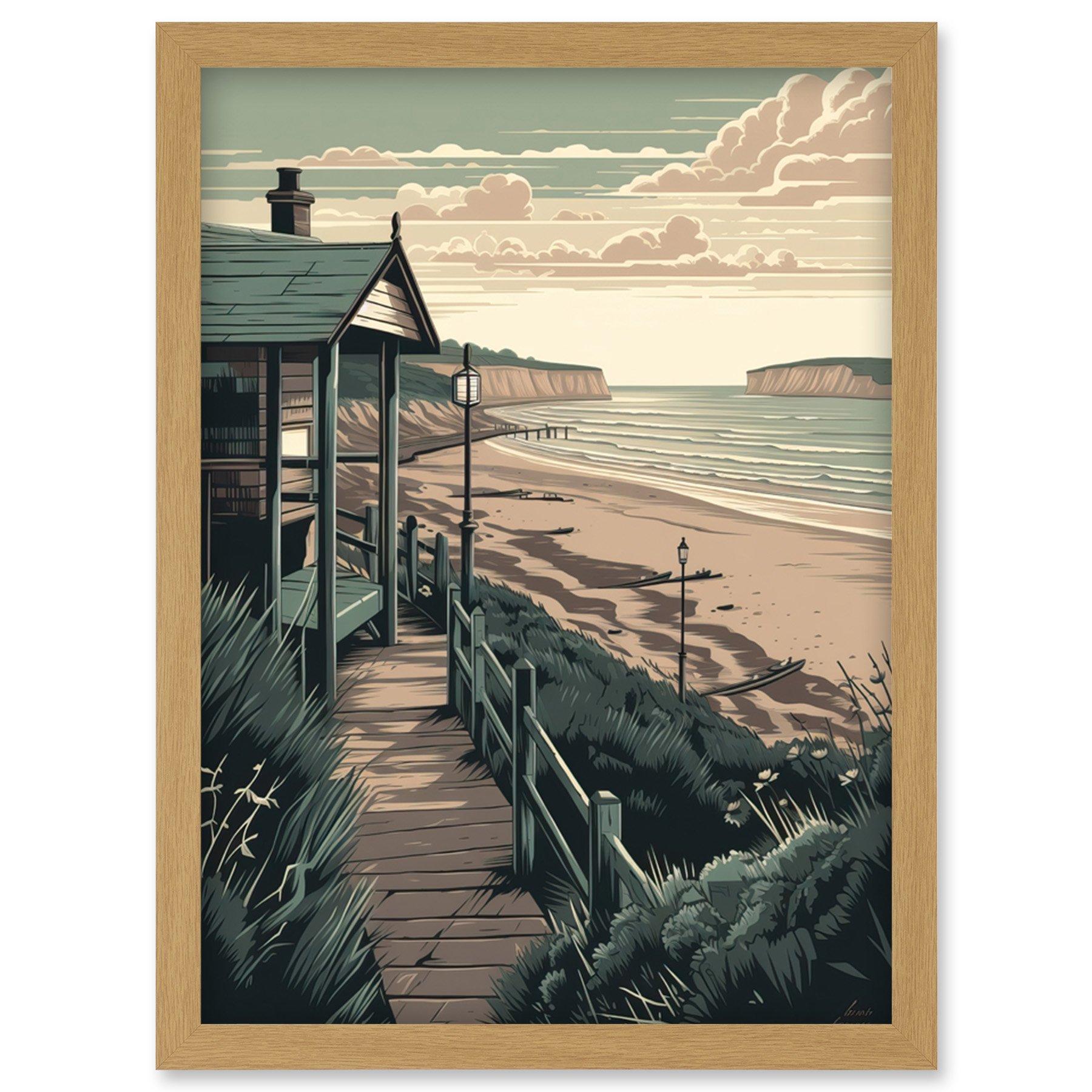Summer Beach House Coastal Landscape Illustration Artwork Framed Wall Art Print A4