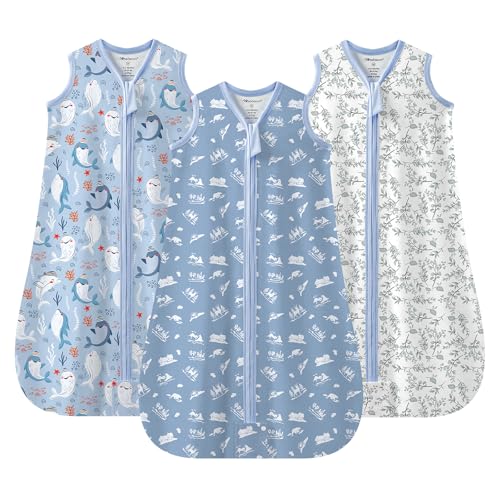 Mosebears Sleeping Bag Baby Summer Sleeping Bag 0.5 Tog 100% Cotton Breathable Baby Sleeping Sack (3 Pack Blue, L)