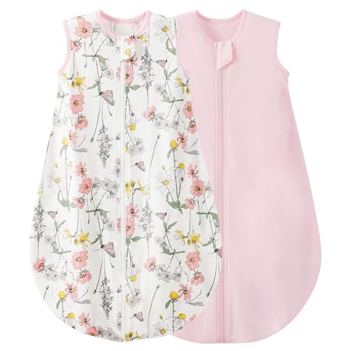 Duomiaomiao Baby Sleeping Bag 2 Pack 0.5 Tog Sleep Sack, Baby Summer Sleeping Bag 100% Cotton Baby Wearable Blanket Unisex Toddler Newborn Sleep Bag 6-18 Months, Flower&Pink