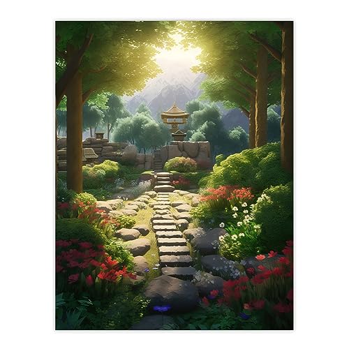 Artery8 Flowers Blooming in Serene Japanese Zen Garden Acrylic Painting Steps Path Leading to Stone Lantern Bathed in Sunlight Large Wall Art Poster Print Thick Paper 18X24 Inch
