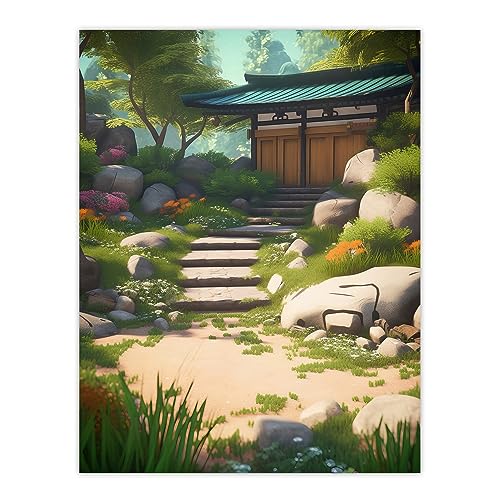Artery8 Zen Garden Bright Painting Stone Steps Bathed in Sunlight Leading to Tea House Serene Spring Bloom Yard Large Wall Art Poster Print Thick Paper 18X24 Inch