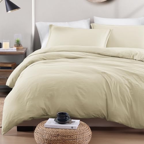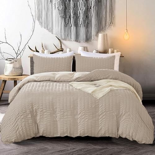 Super King Seersucker Bedding Set Khaki Duvet Cover with 2 Pillowcases Soft Breathable Microfiber Duvet Cover Set 220x260cm