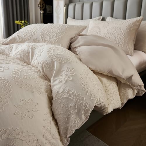 Herside Super King Size Tufted Bedding Set Vintage Farmhouse Duvet Cover Set 3pcs Boho Circular Tufted Printed Embroidery Microfibre Quilt Cover Set Cottage Home Decor for Girls Teens Adult