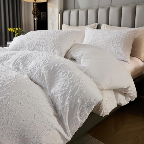 Herside Boho Tufted Duvet Cover Set Super King White Farmhouse Bedding Set Lightweight Circular Tufted Design Vintage Chic Quilt Cover Microfibre Bedding Cover All Season with 2 Pillowcases