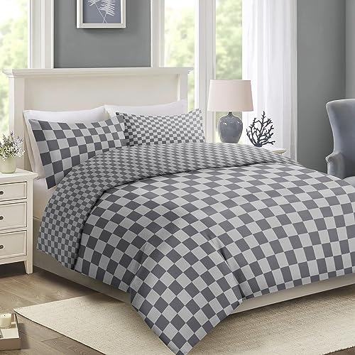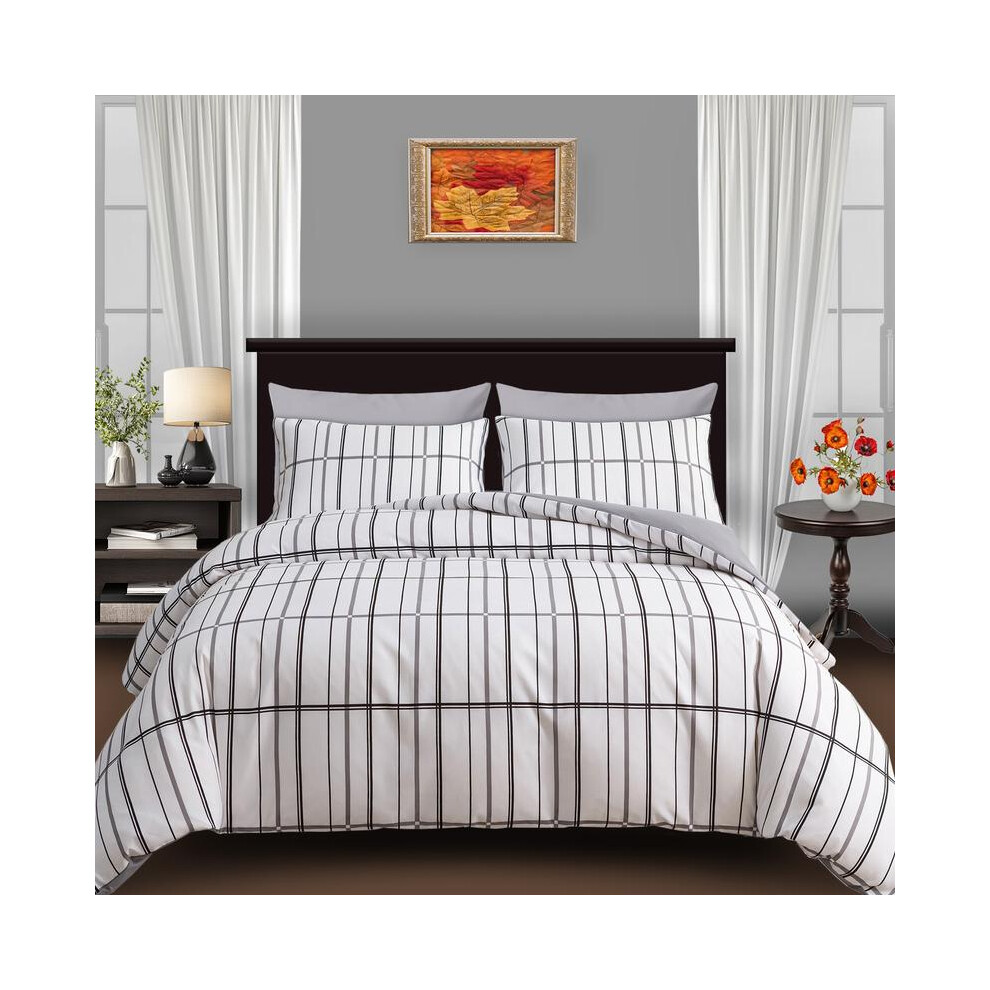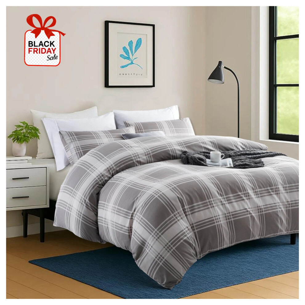 Imperial Rooms Super King Duvet Set Soft Printed Bedding Sets Brushed Microfiber Duvet Covers with Pillowcases (Grey Check 260x220 CM)