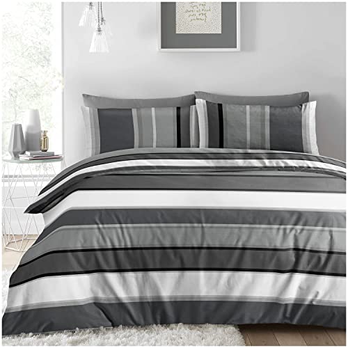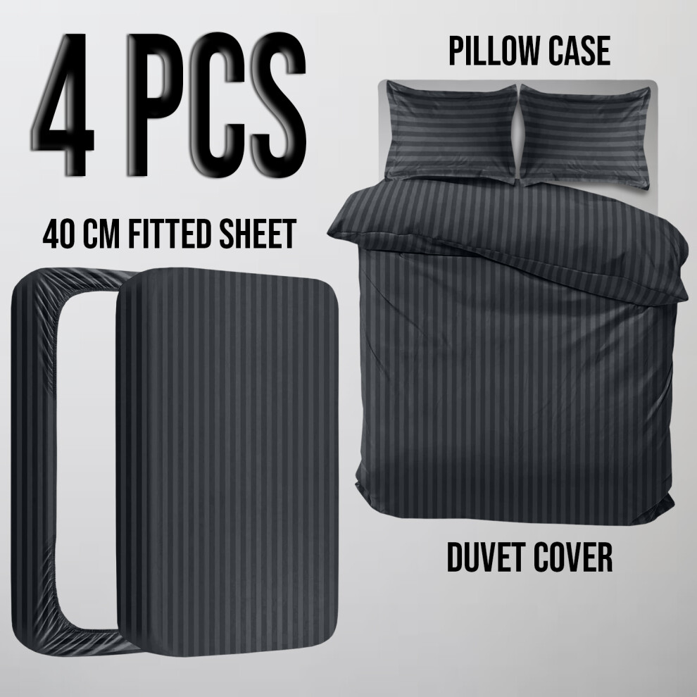 (Super King, Charcoal) Stripe Duvet Covers Bedding Set Fitted Sheet & Pillowcase