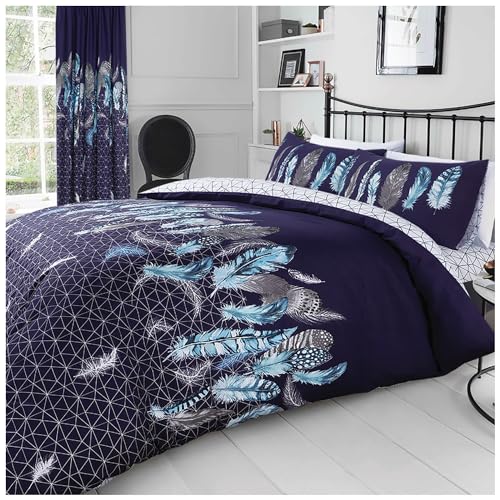 Polycotton Duvet Covers Super King Size, Feather Print Bedding Sets, Cosy Comforter Bed Set, Navy