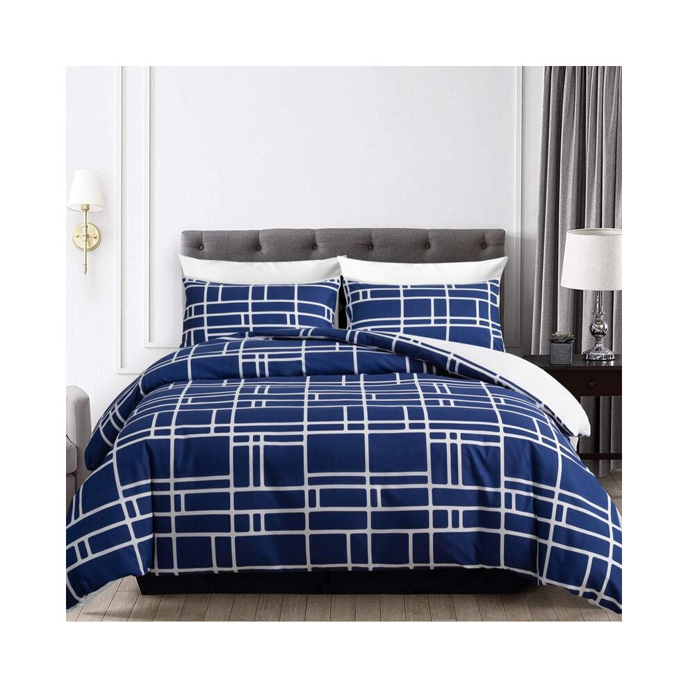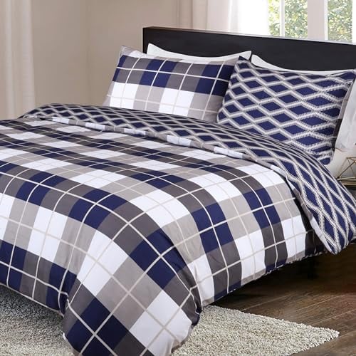 Imperial Rooms Super King Duvet Set Soft Printed Bedding Sets Brushed Microfiber Duvet Covers with Pillowcases (Navy Check 260x220 CM)