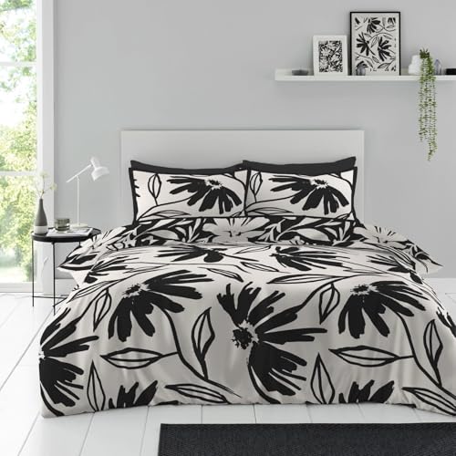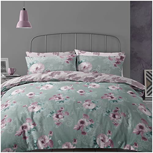 Super Dreamer Botanical Duvet Cover, Fitted Sheet With Pillow Cases, 4 Piece Floral Bedding & Linen, Complete Bed Set King Size, Grey/Blush Pink, 11693888