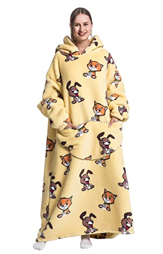 Seogva Extra Long Wearable Blanket Hoodie, Oversized Sweatshirt for Women and Men, Super Warm Cozy Giant Hooded, Thick Flannel with Sleeves Pocket (Kitty & Puppy)
