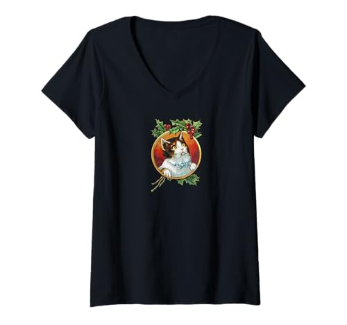 Womens Super Cute Vintage Victorian Christmas Kitty Meowy Catmas V-Neck T-Shirt