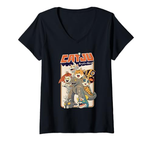 Women's Catju Super Cat Monster Parody Retro Kaiju Feline Japanese V-Neck T-Shirt