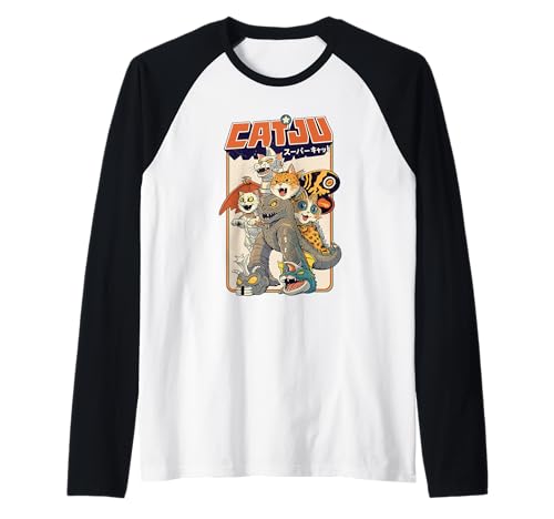 Catju Super Cat Monster Parody Retro Kaiju Feline Japanese Raglan Baseball Tee