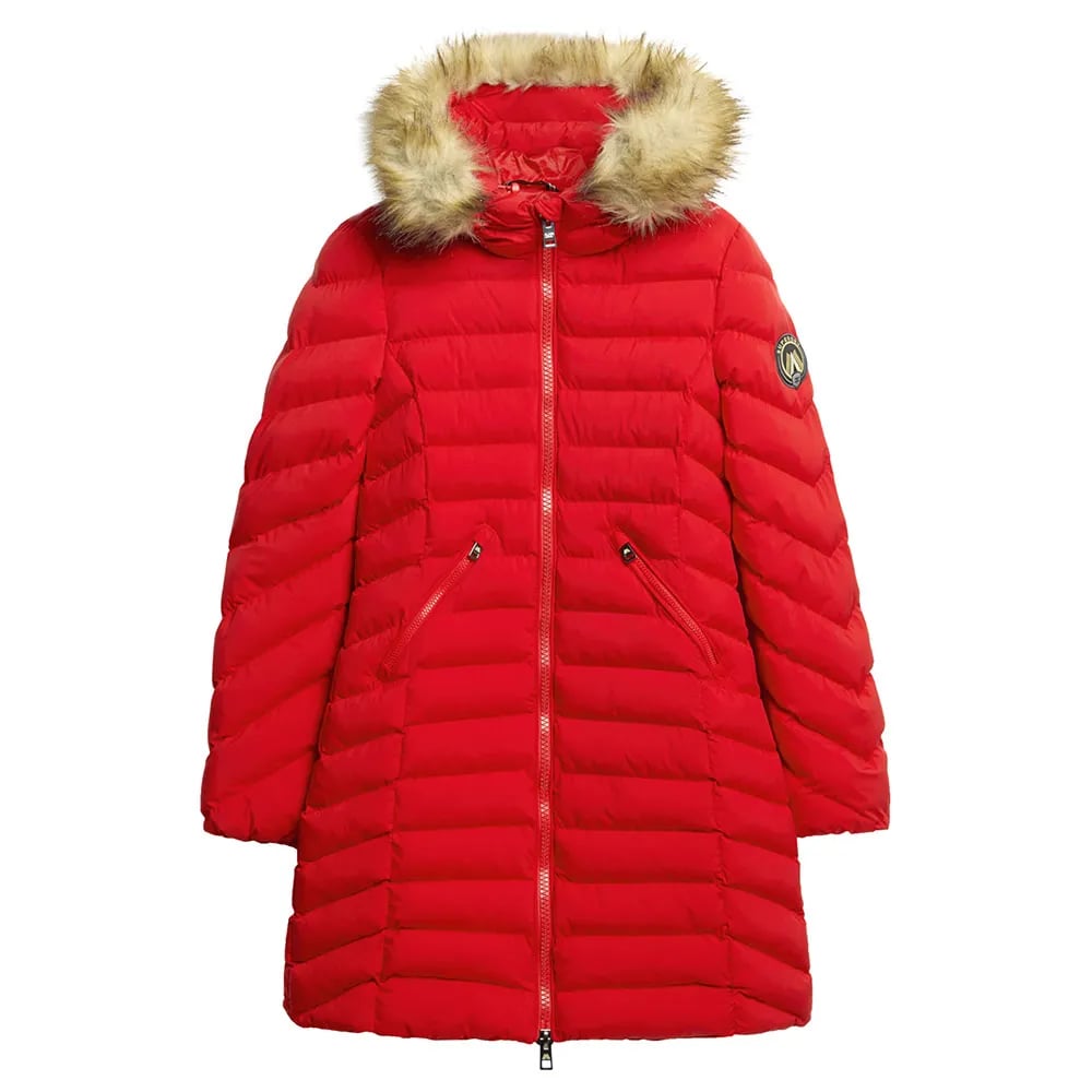 Superdry Womens Red Fuji Faux Fur Hooded Padded Mild Length Jacket Size 16