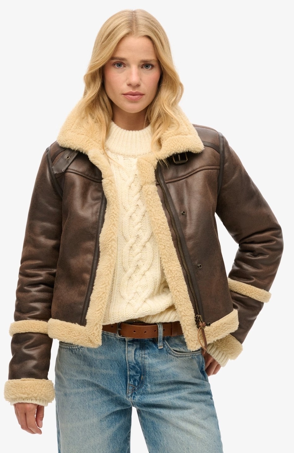SUPERDRY Women’s Brown Faux Shearling Cropped Aviator Flying Jacket - Size UK 12