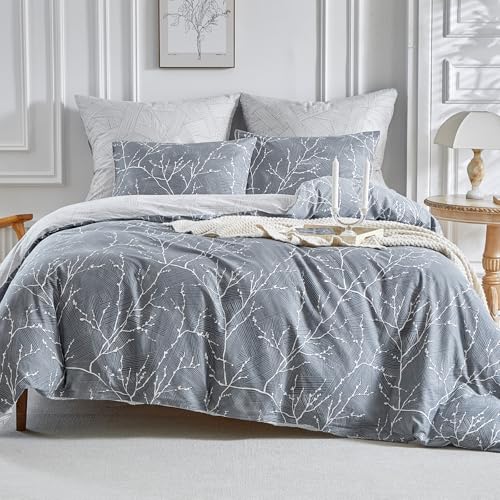 Lekesky 200T Cotton Super King Duvet Set Grey Bedding Set, Botanical Branches Printed Superking Bedding Set (1x Duvet Cover, 2x Pillowcases) Cotton Duvet Cover Sets 260x220 cm, Grey