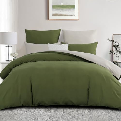 Aisbo Super King Size Duvet Cover Set - 3Pcs Reversible Bedding Bed Set Olive Green and Beige Superking Soft Brushed Microfiber Quilt Cover with 2 Pillowcases 50x75cm