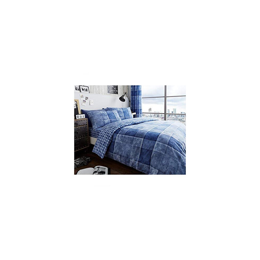 Duvet Cover Set Super King Size superKing Bed With Pillowcases Quilt Bedding Set Printed Reversible Poly Cotton , Denim Check Blue