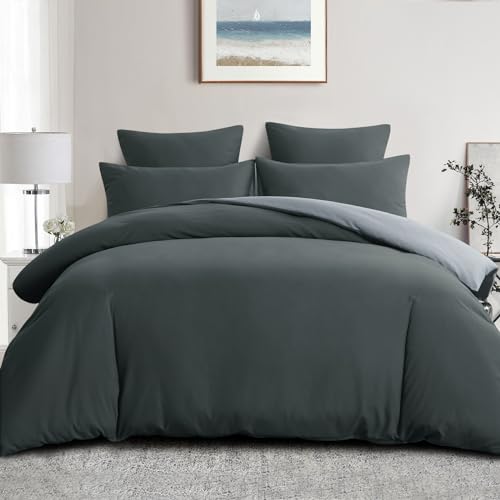 Soifox Super King Duvet Cover Set - Microfiber Plain Dark Grey Bedding Bed Set with Pillow Cases, Soft Zipper Closured Quilt Cover Superking Size Bed, Charcoal Grey