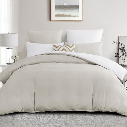 Aisbo Super King Size Duvet Cover Set - 3Pcs Reversible Bedding Bed Set Beige and White Superking Soft Brushed Microfiber Quilt Cover with 2 Pillowcases 50x75cm