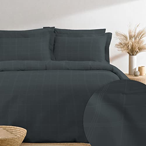 Pizuna 300TC Damask Check SuperKing Duvet Cover Set Anthracite Grey, 100% Long Staple Cotton Checkered Bedding Set Lightweight Sateen Weave Duvet Cover Set with 4 Corner ties and Hidden Button Closure