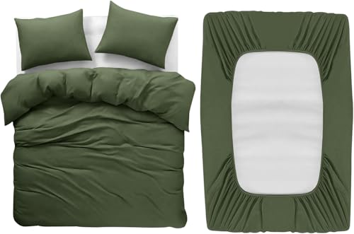 BedLooms 4 Piece Super King Bedding Set Olive Green Duvet Cover Sets Fitted Sheet with Pilow cases Superking Duvet Set Soft and Fade Resistant Brushed Microfiber Bedding Quilt Cover Set