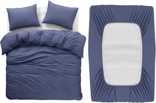 BedLooms 4 Piece Super King Bedding Set Washed Blue Duvet Cover Sets Fitted Sheet with Pilow cases Superking Duvet Set Soft and Fade Resistant Brushed Microfiber Bedding Quilt Cover Set