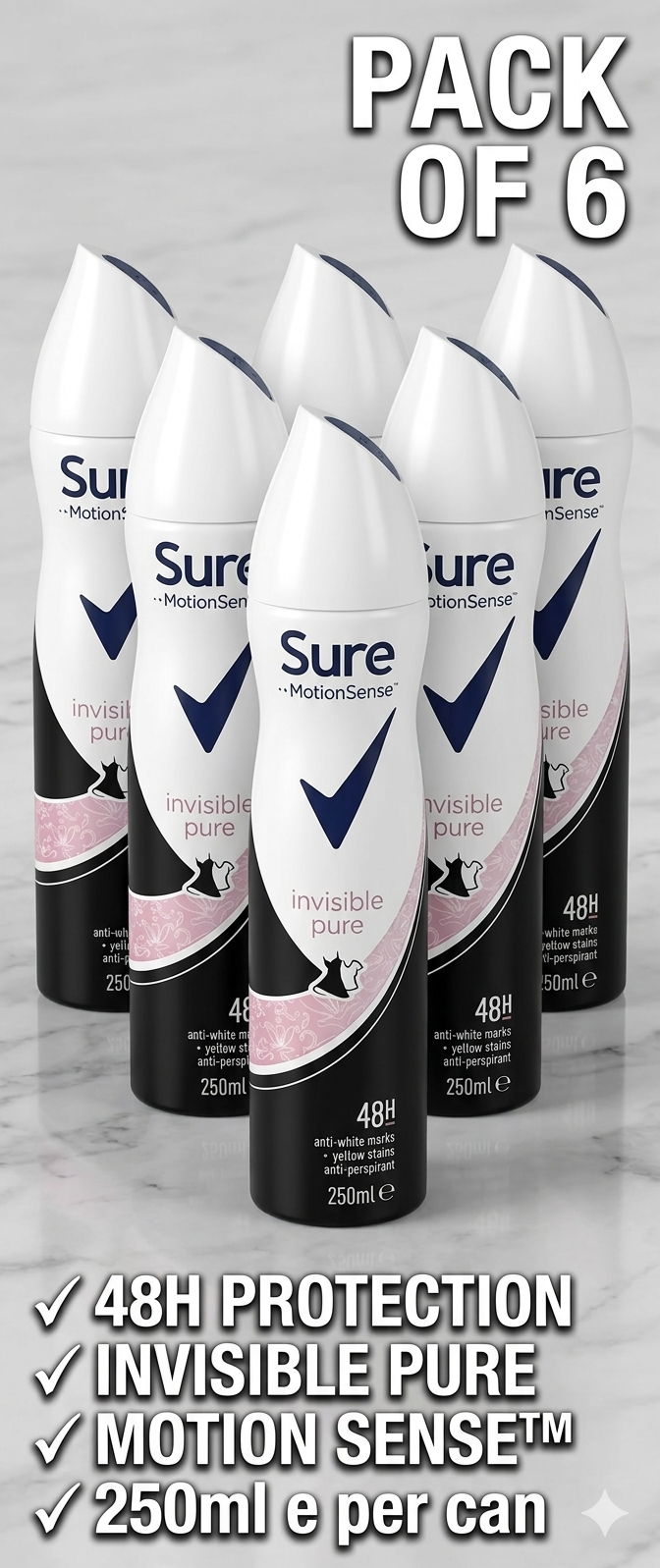6 X 250ml Sure Invisible Pure Antiperspirant Spray 48h Protection Womens