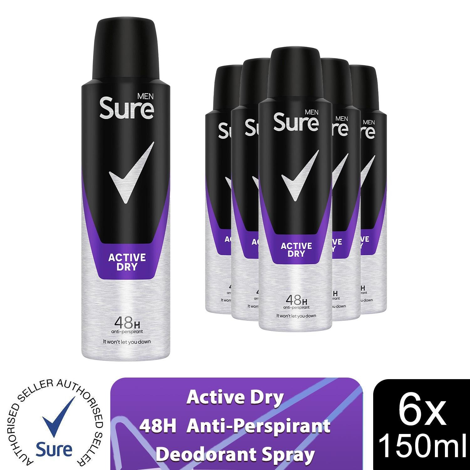 Sure Men Anti Perspirant 48H Protection Active Dry Deodorant, 6 Pack, 150ml