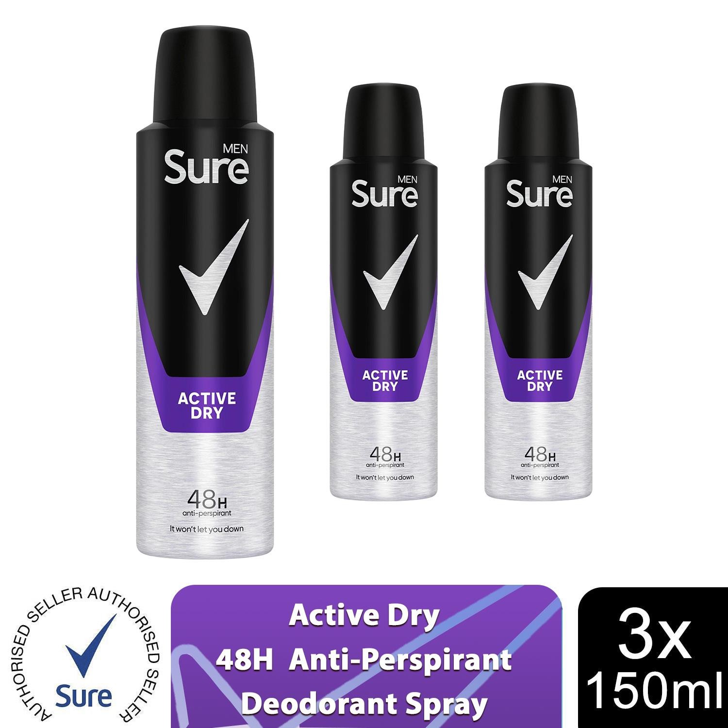 Sure Men Anti Perspirant 48H Protection Active Dry Deodorant, 3 Pack, 150ml