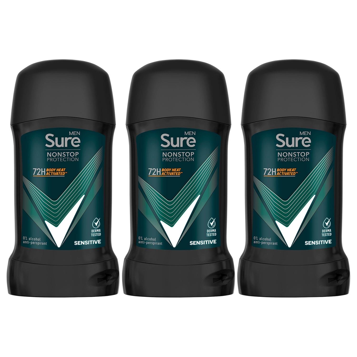 Sure Mens Men AntiPerspirant Deodorant Stick Sensitive 72H Nonstop Protection, 3x50ml - One Size