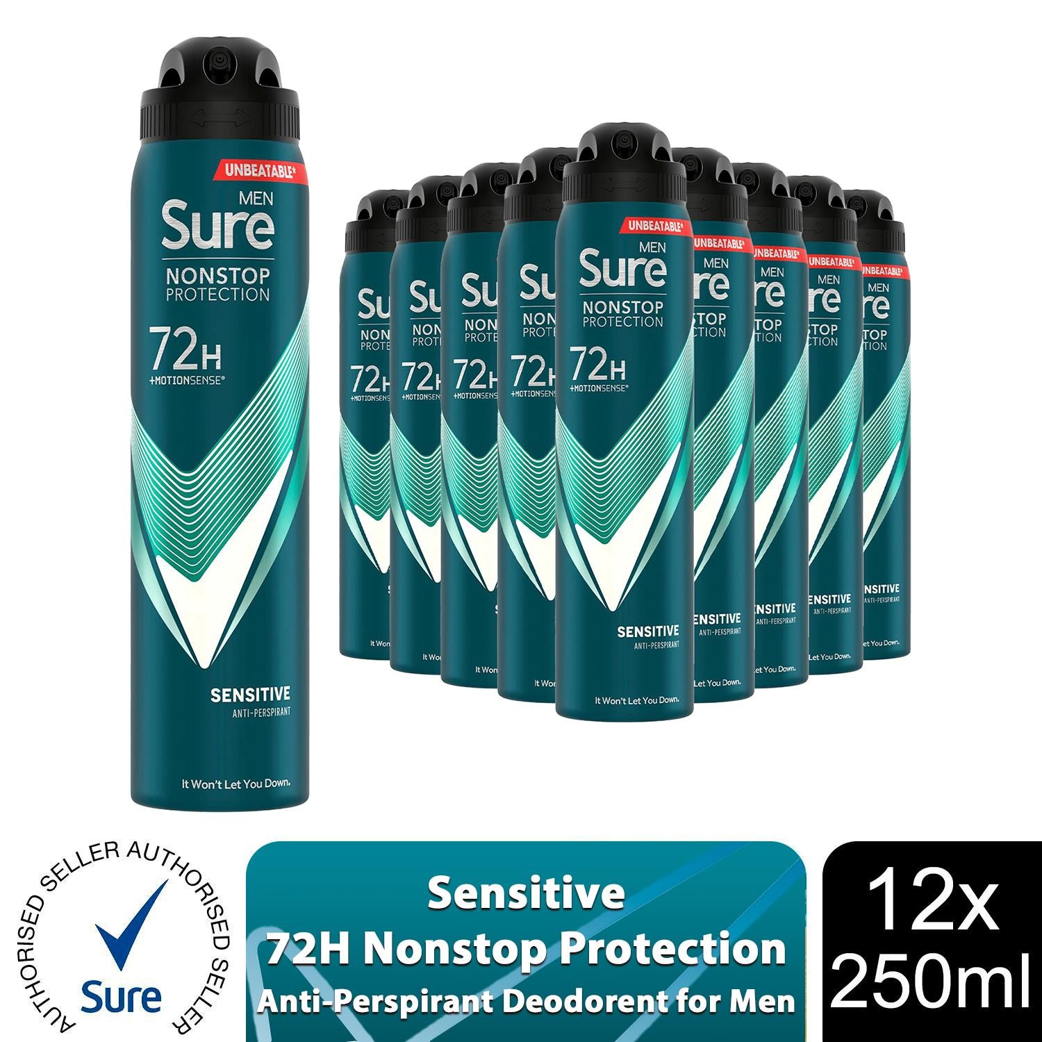 Sure Men Antiperspirant Deodorant Sensitive 72H Nonstop Protection 250ml, 12Pack