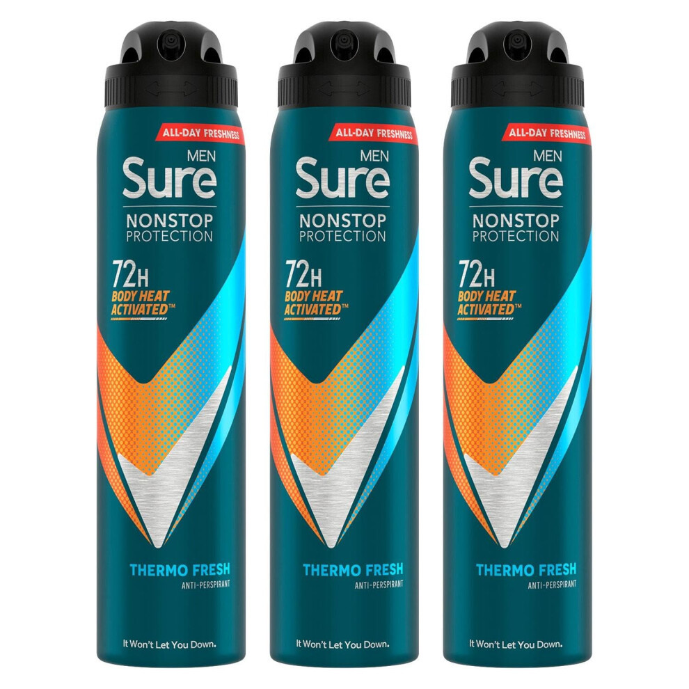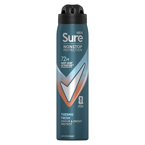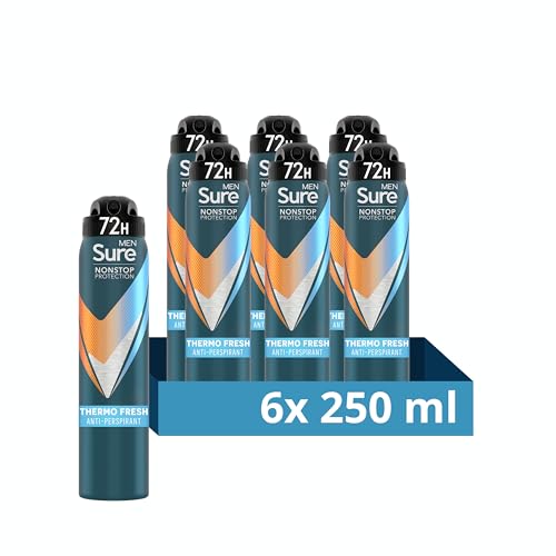 Sure Men Nonstop Protection Thermo Fresh Anti-Perspirant Aerosol Men's Deodorant Spray with Body Heat Activated technology and a clean fragrance for 72 hour odour and sweat protection 6x 250 ml