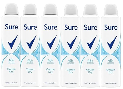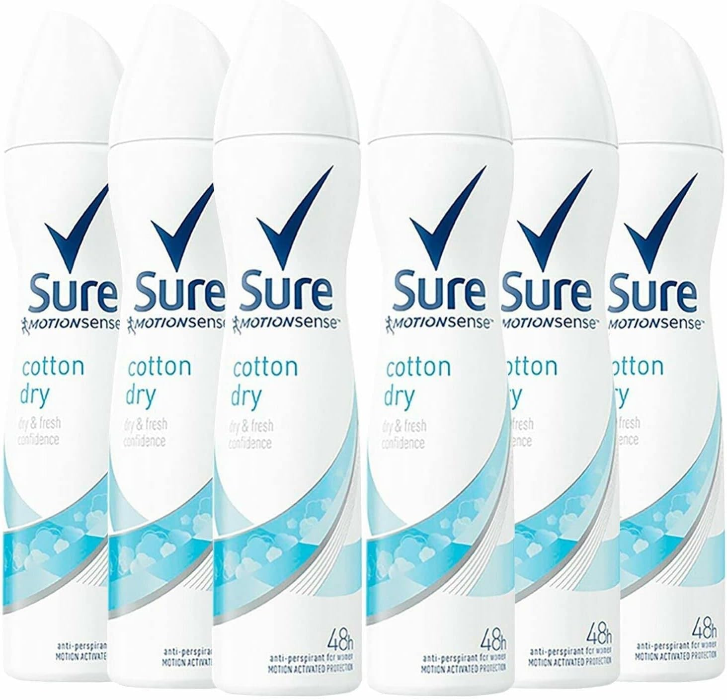 Sure Cotton Dry Anti-Perspirant Aerosol Women's Deodorant Spray with a clean fragrance inspired by fresh cotton sheets for 48 hour protection against sweat and odour 6x 150 ml
