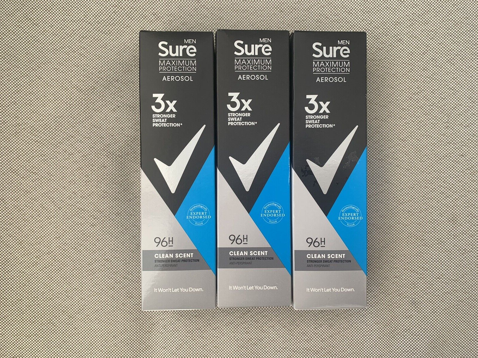 3 x Sure Men 96H Maximum Protection Antiperspirant Spray 150ml Clean Scent BNIB