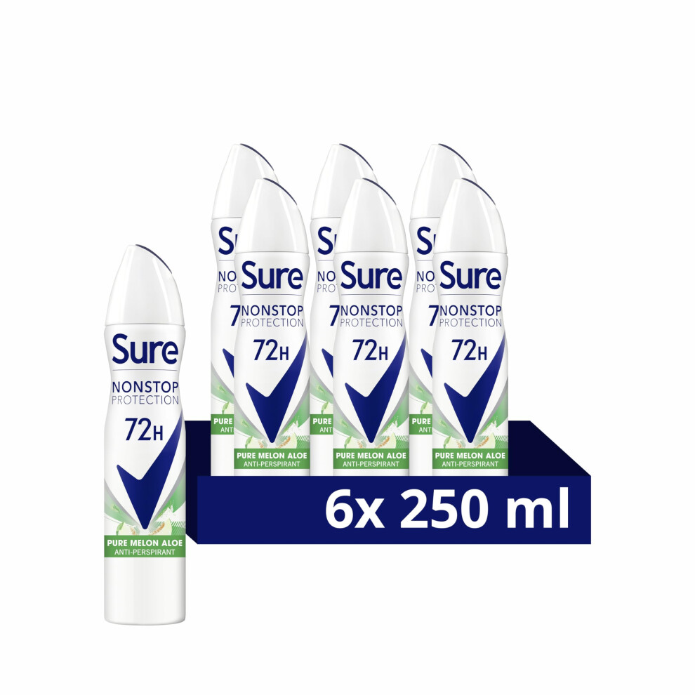 Sure Women Nonstop Protection Pure Melon Aloe Deodorant Body Spray Antiperspirant with body heat activated technology for 72 hour odour and sweat protection 250 ml, Pack of 6