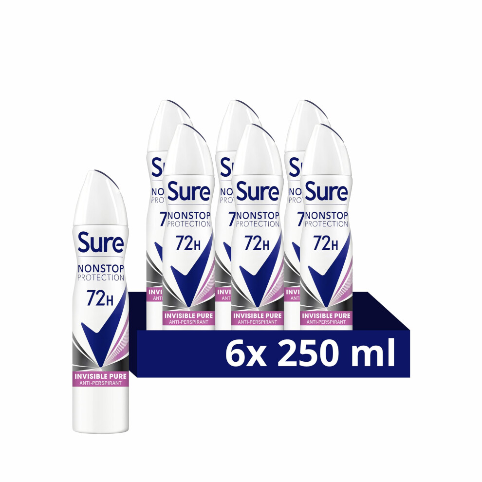 Sure Women Nonstop Protection Invisible Pure Deodorant Body Spray Antiperspirant with body heat activated technology & white mark protection for 72 hour odour and sweat protection 250 ml, Pack of 6