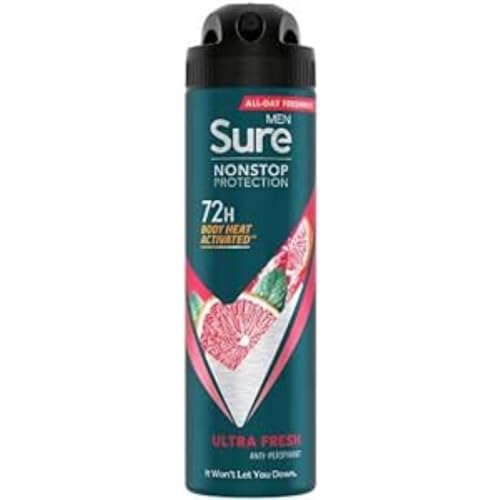 Sure Men Nonstop Protection Ultra Fresh Deodorant Body Spray Antiperspirant with a fruity scent & body heat activated technology for 72 hour odour and sweat protection 150 ml, Pack of 6