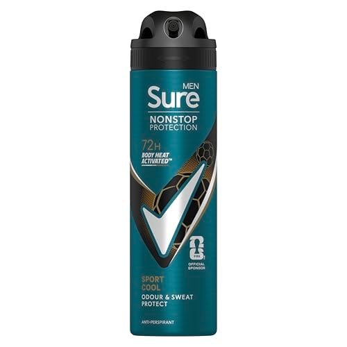 Sure Men Nonstop Protection Sport Cool Deodorant Body Spray Antiperspirant with a mint and citrus scent & body heat activated technology for 72 hour odour and sweat protection 150 ml