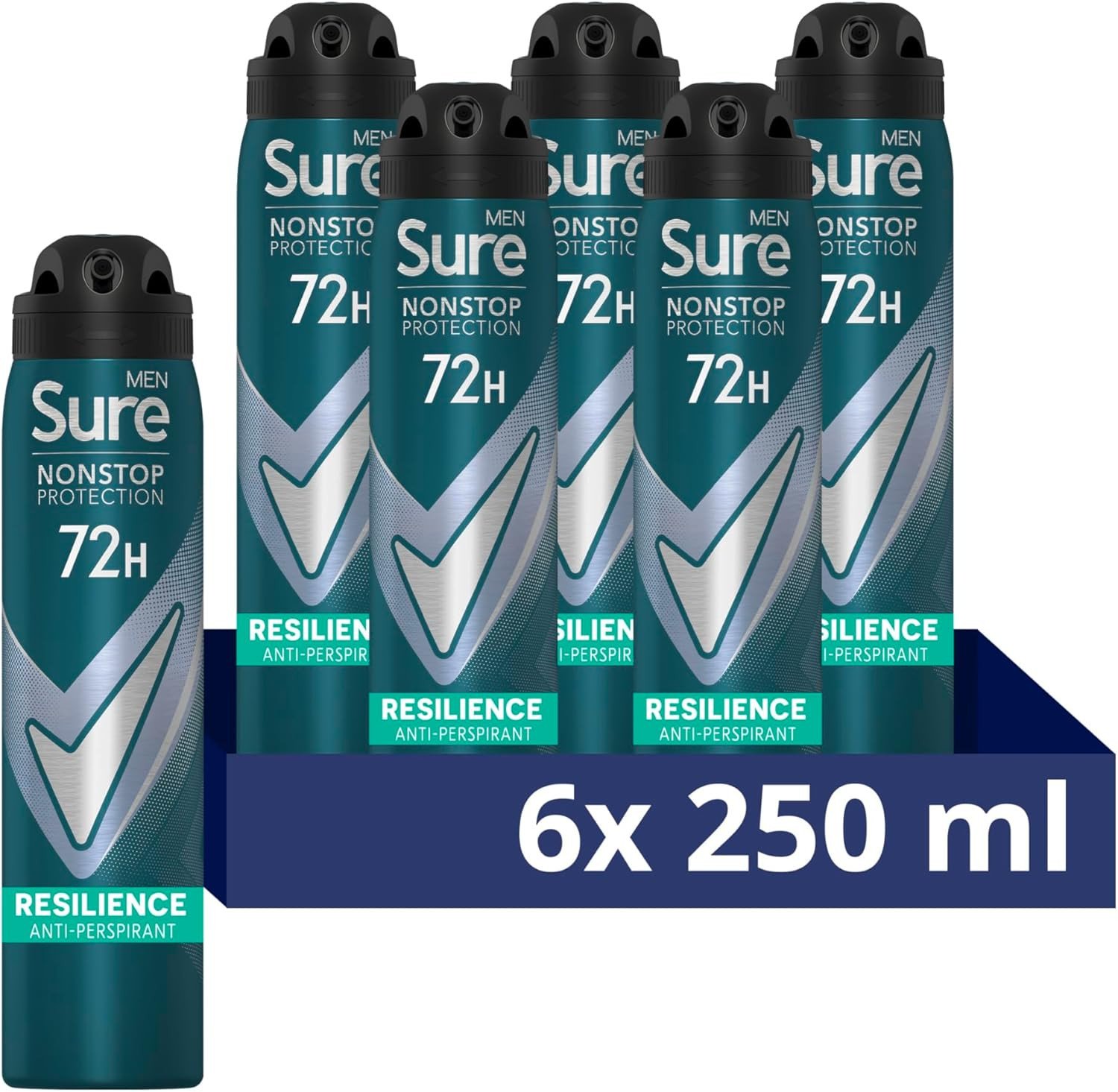 Sure Men Nonstop Protection Resilience Deodorant Body Spray Antiperspirant with body heat activated technology for 72 hour protection against odour and sweat 250 ml, Pack of 6