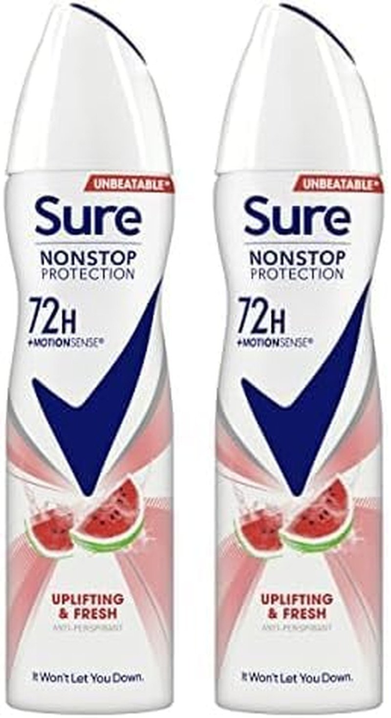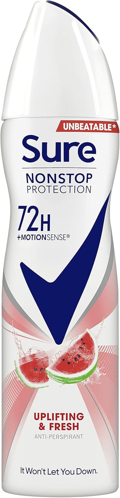 Sure Women Nonstop Protection Watermelon Fresh Deodorant Body Spray Antiperspirant with a watermelon and cactus scent & body heat activated technology for 72 hour odour and sweat protection 250 ml, Pack of 6