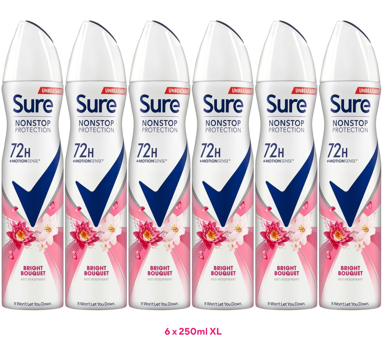6 x 250ml XL Sure Women BRIGHT BOUQUET Antiperspirant Deodorant Body Spray