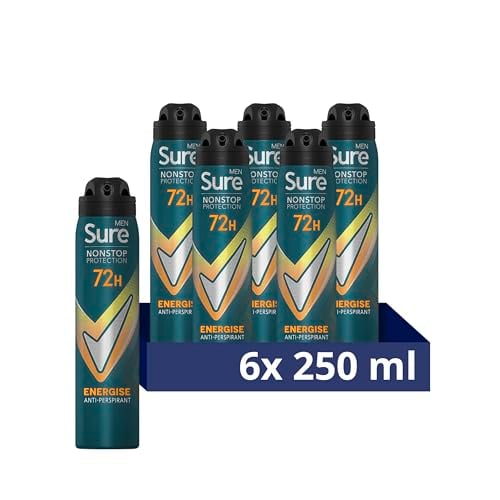 Sure Men Nonstop Protection Energise Deodorant Body Spray Antiperspirant with body heat activated technology for 72 hour protection against odour and sweat 250 ml, Pack of 6