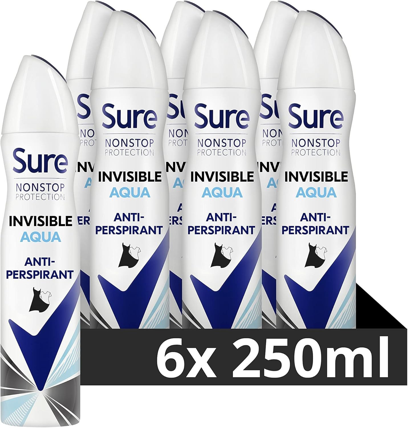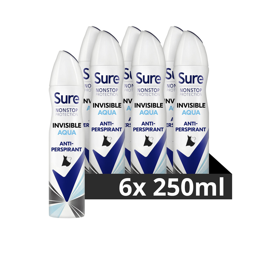 Sure Women Nonstop Protection Invisible Aqua Deodorant Body Spray Antiperspirant with body heat activated technology & white mark protection for 72 hour odour and sweat protection 250 ml, Pack of 6