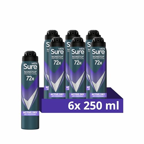 Sure Men Nonstop Protection Active Dry Deodorant Body Spray Antiperspirant withan energising scent & body heat activated technology for 72 hour odour and sweat protection 250 ml, Pack of 6