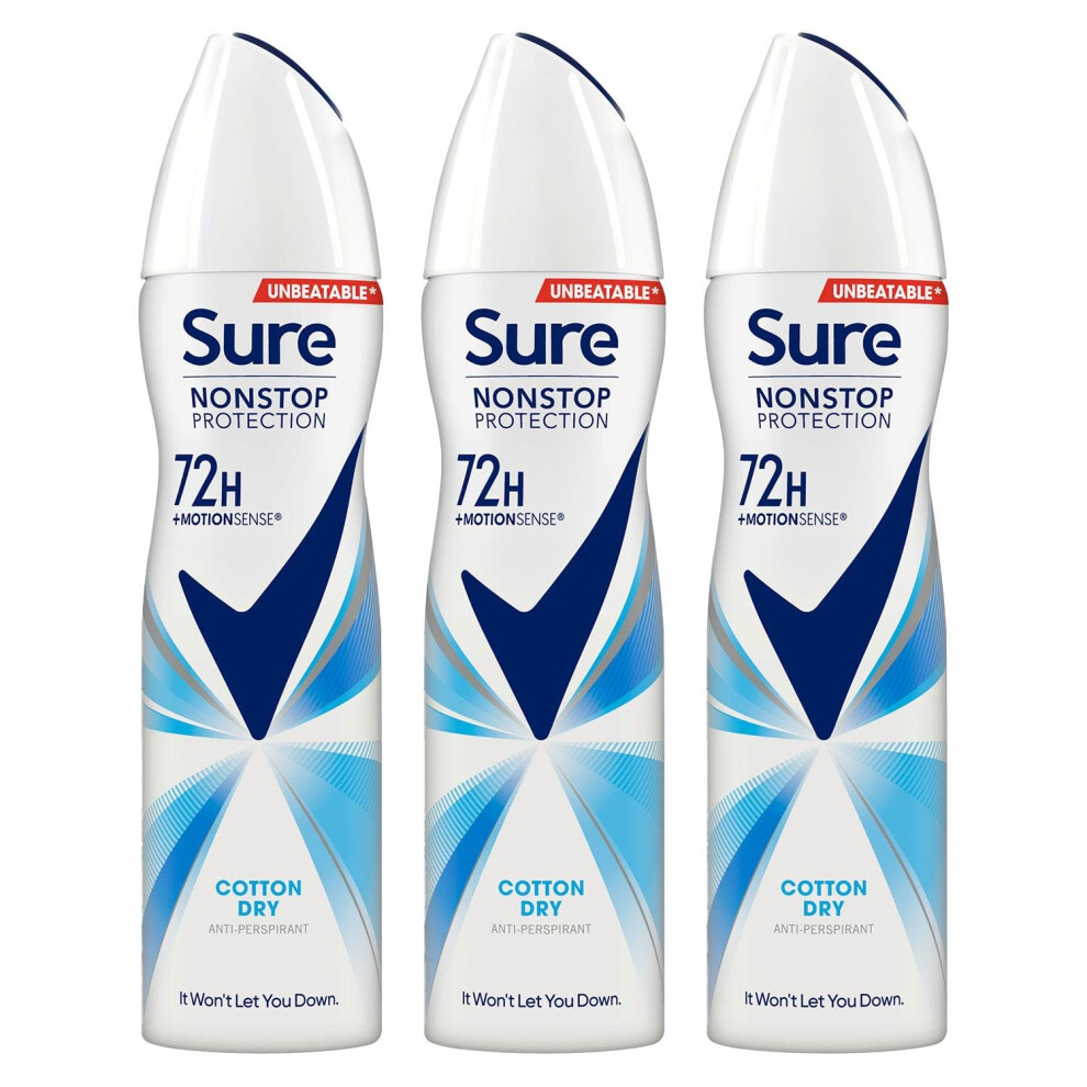 3 X Sure Anti-Perspirant Deodorant Spray Cotton Dry 3 x 150ml Free P&P