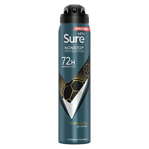 Sure Men Nonstop Protection Sport Cool Deodorant Body Spray Antiperspirant with a mint and citrus scent & body heat activated technology for 72 hour odour and sweat protection 250 ml