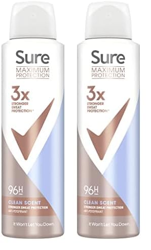 Sure Maximum Protection Clean Scent Anti-perspirant Deodorant Aerosol 96h protection anti-perspirant deodorant spray for 3x stronger* sweat protection 150 ml (Pack of 2)