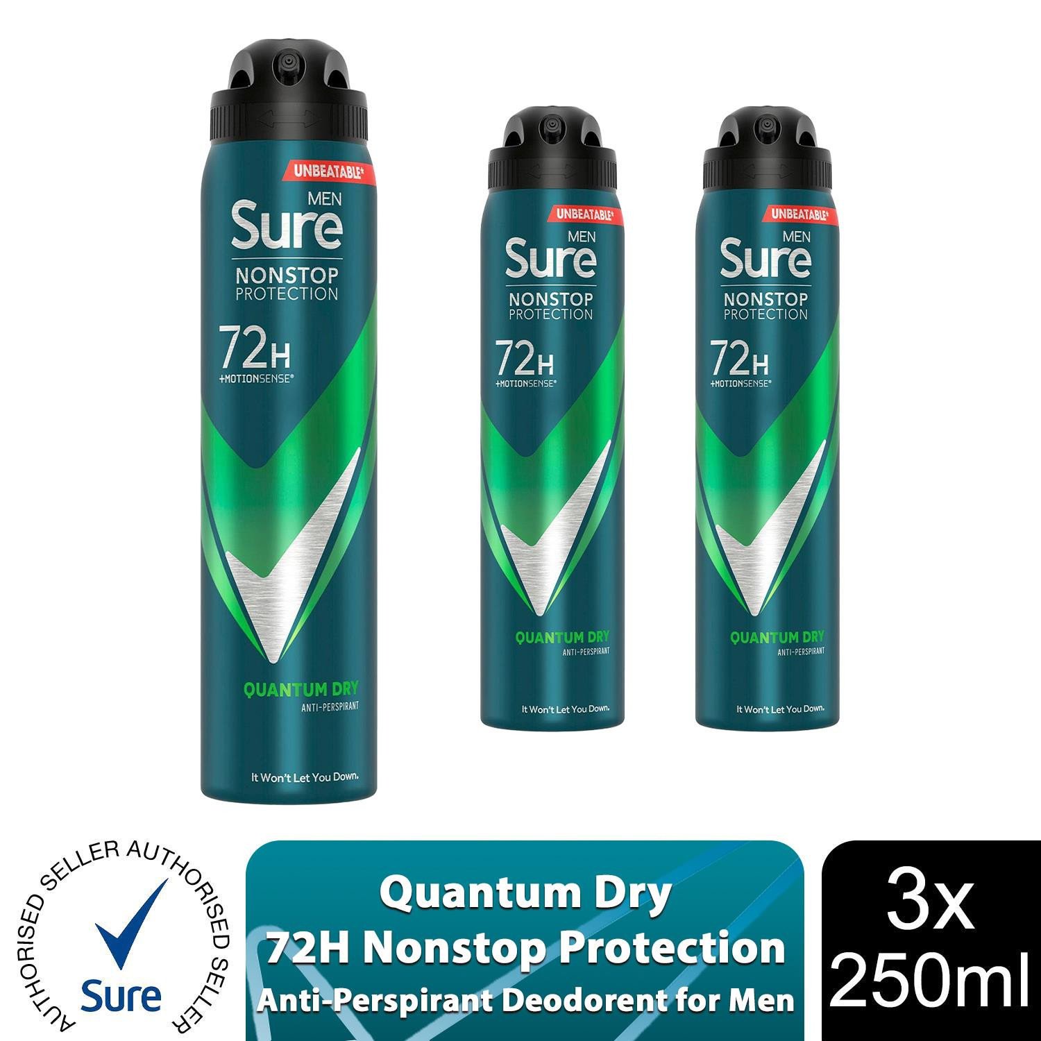 3x Sure Men Anti-perspirant 72H Nonstop Protection Quantum Dry Deodorant, 250ml
